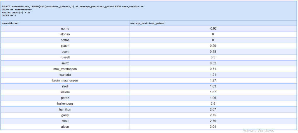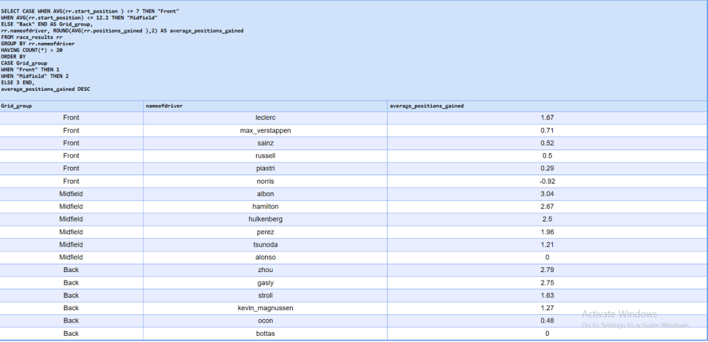 From these queries I can determine that the most movement in an F1 race occurs in the midfield, where drivers starting outside the top ten such as Albon, Zhou and Gasly are able to recover multiple places on average. However, with race victories overwhelmingly determined by starting position, this movement rarely translates into wins. Average position gained limits insights for front field drivers as they’re capped with their grid to gain positions.